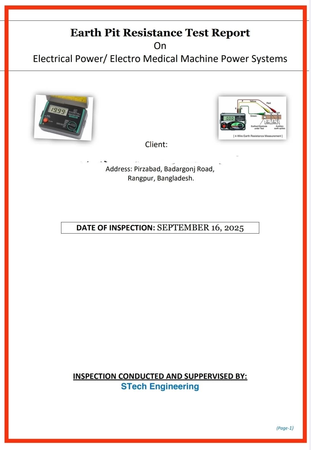 STech Engineering successfully executed a complete Earth Resistance Test service at Prime Medical College in Rangpur. This critical safety and compliance procedure was conducted using the KYORITSU KEW 4105A Digital Earth Test Meter, ensuring highly accurate and reliable measurements. Following the test, a detailed and professional report was generated, providing the client with certified documentation of their grounding system's integrity.
